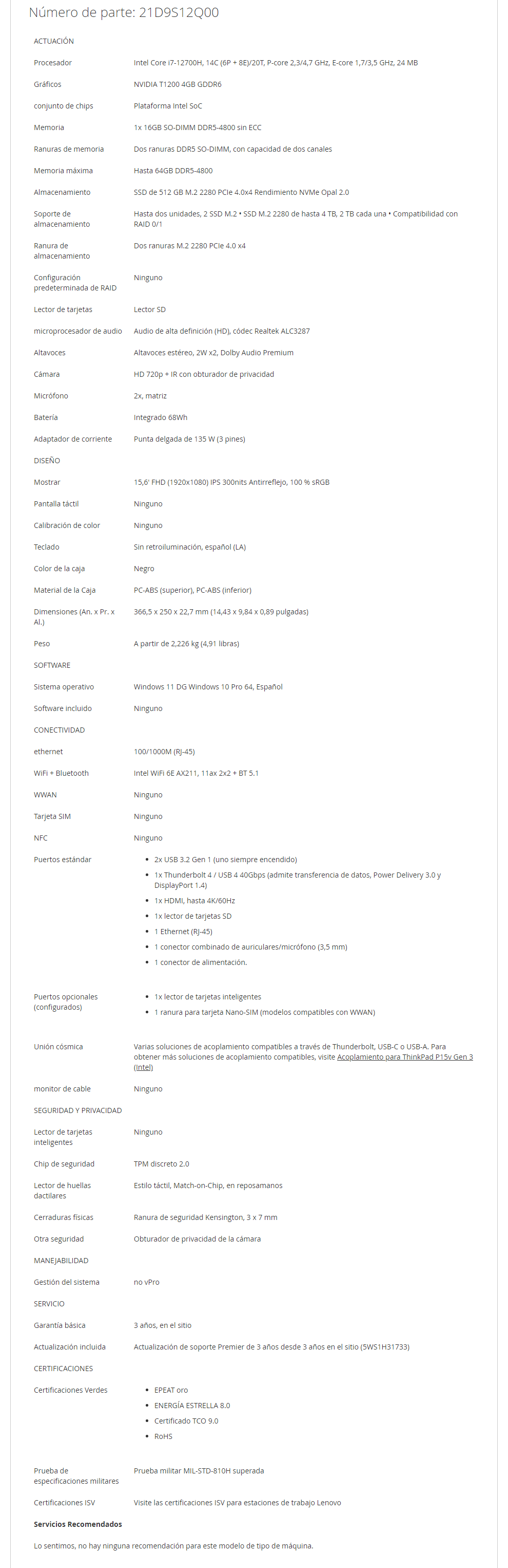 Laptop LENOVO Workstation P15V G3 / 15.6” Full HD / Intel Core I7-12700H / 16GB Ram / SSD 512GB M.2 NVME / Nvidia T1200 4GB / Windows 11 Pro / Español / Negro / 21D9S12Q00