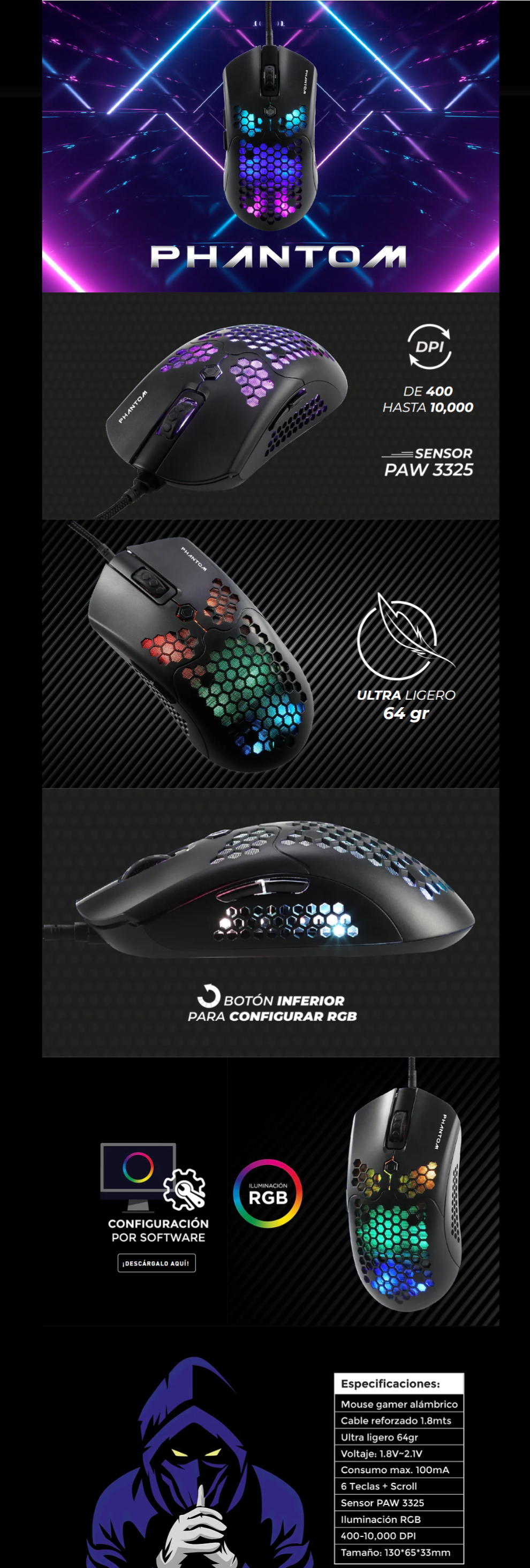 Mouse Gamer NACEB Phantom Rgb / Alámbrico / USB / 6 Botones + Scroll / 400-10000 DPI / Sensor PAW3325 / Negro