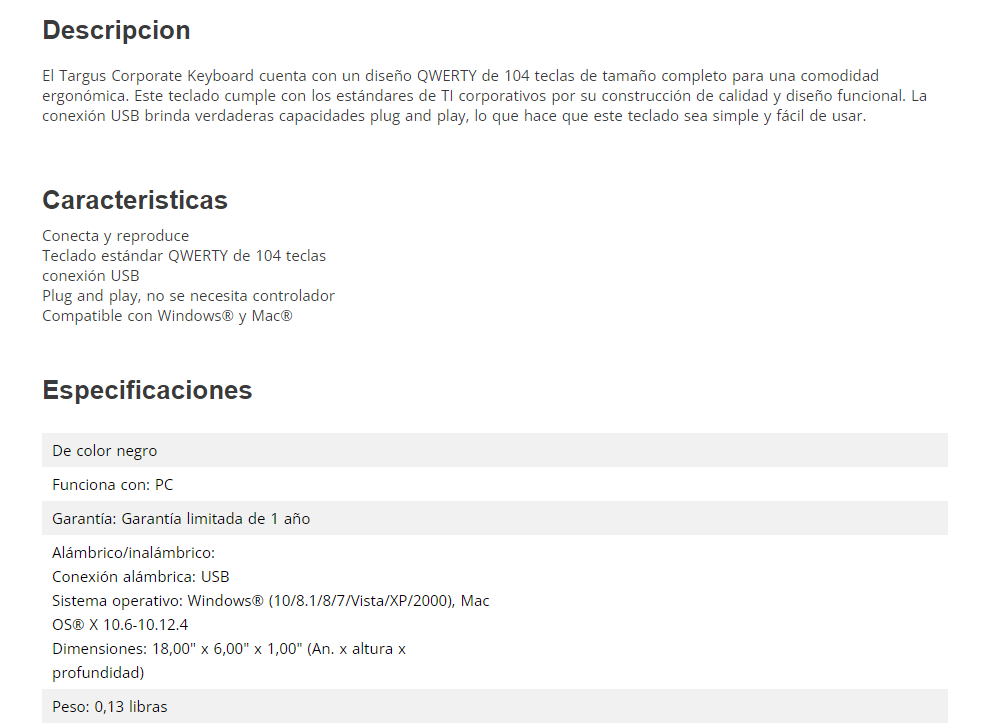 El Targus Corporate Keyboard cuenta con un diseño QWERTY de 104 teclas de tamaño completo para una comodidad ergonómica. Este teclado cumple con los estándares de TI corporativos por su construcción de calidad y diseño funcional. La conexión USB brinda verdaderas capacidades plug and play, lo que hace que este teclado sea simple y fácil de usar.
