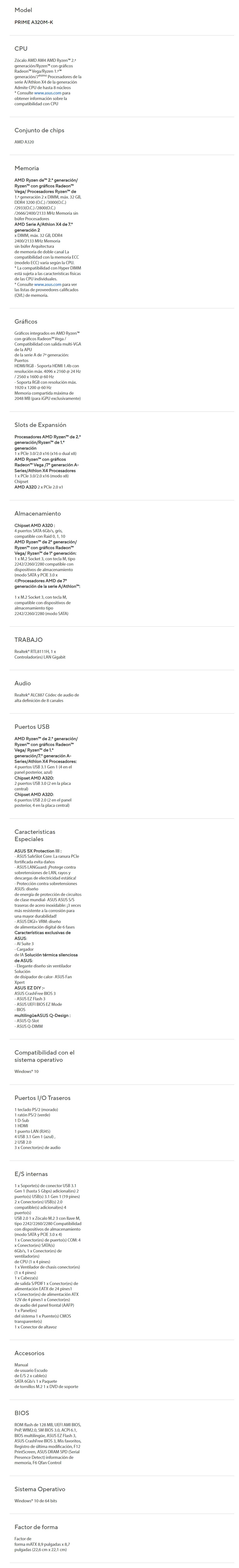 Tarjeta Madre ASUS Prime A320m-K / Usb 3.1 / 32GB X2 DDR4 3200Mhz / Hdmi / Vga / RYZEN 5000 Ready / PRIME A320M-K
