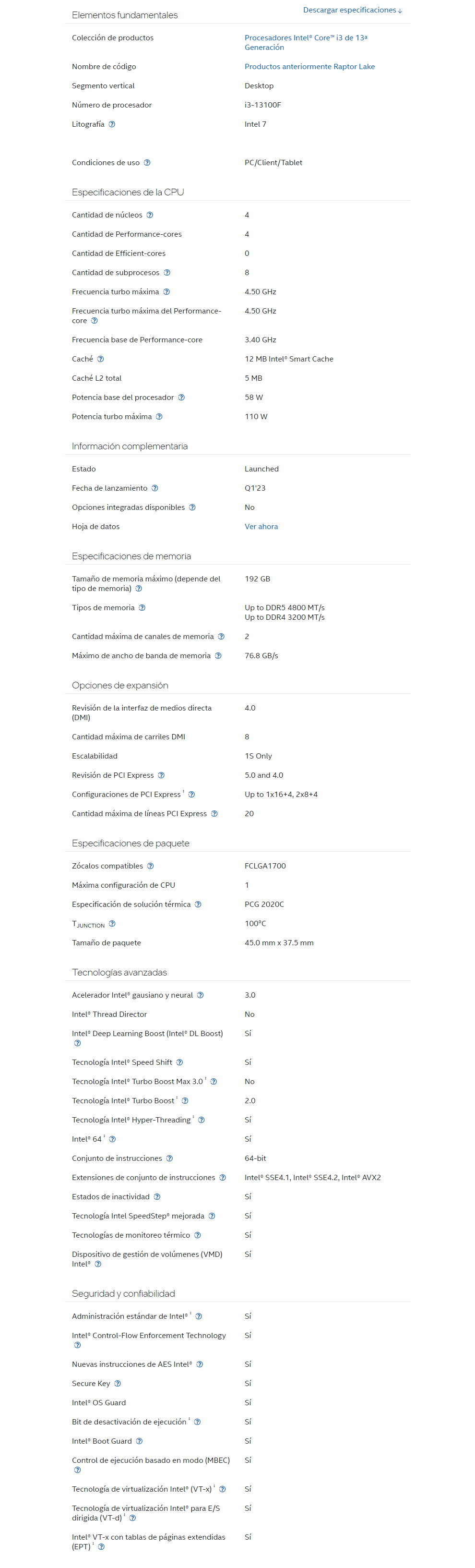 Procesador INTEL Core I3-13100F / LGA 1700 / 13TH Gen / 3.40Ghz-4.50Ghz / 4 Núcleos / 8 Hilos / SIN GRÁFICOS / CON DISIPADOR