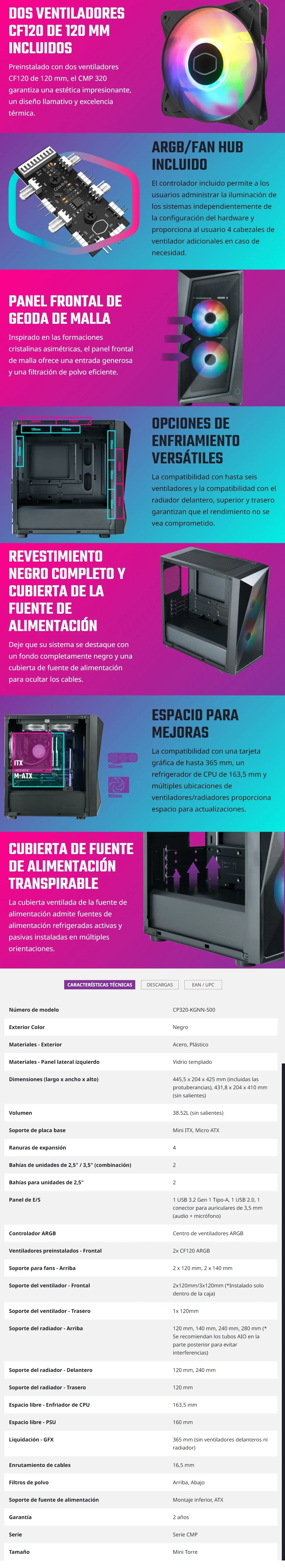 Gabinete COOLER MASTER CMP320 / Micro-ATX / Cristal Templado / 2 Vent. Incluidos / USB 2.0, 3.2 / Negro