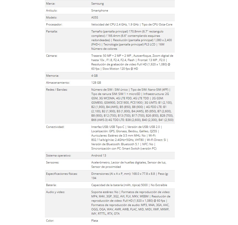 Smartphone SAMSUNG A05S / 6.7″ / Octa-Core / Almacenamiento 128GB / Ram 4GB / Cámara 50MP+2MP+2MP/13MP / Android 13 / Plata