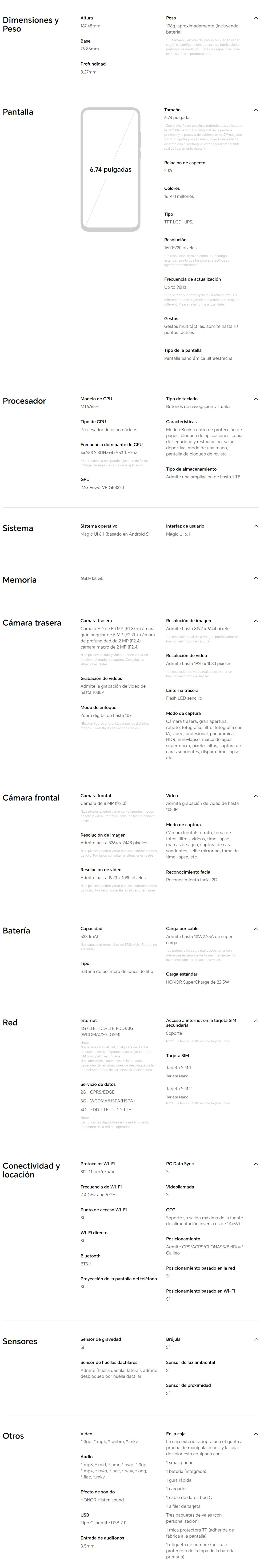 Smartphone HONOR X7A / 6.74″ / MediaTek / Almacenamiento 128GB / Ram 6GB / Cámara 50MP+5MP+2MP+2MP/8MP / Android S / Plata Titanio