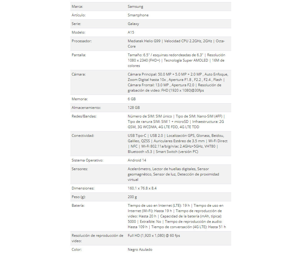 Smartphone SAMSUNG GALAXY A15 / 6.5″ / OctaCore / Almacenamiento 128GB / RAM 6GB / Cámara 50MP+5MP+2MP/13MP / Android / Negro Azulado