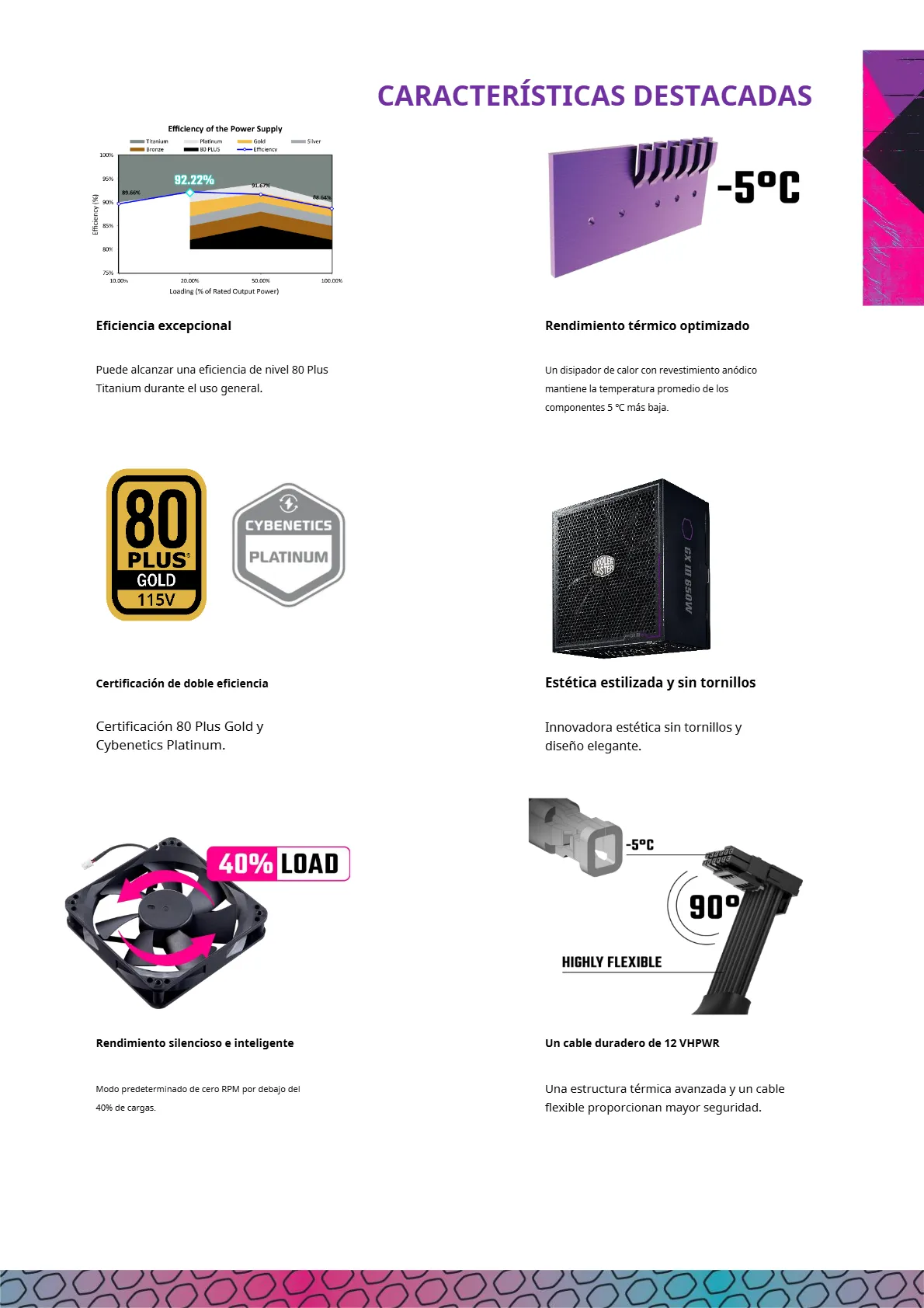 • Soporte ATX 3.0 y un cable 12VHPWR de 90 grados