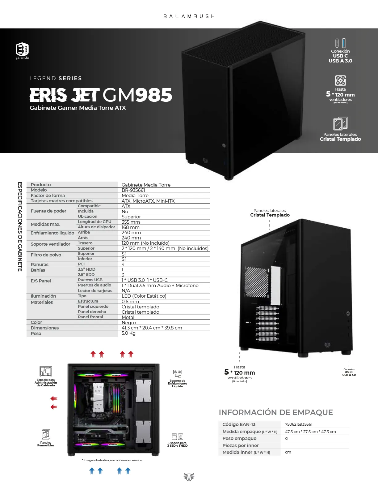 • En cuanto a la refrigeración, el Gabinete Balam Rush Eris Special GM985 puede soportar ventiladores traseros con un diámetro máximo de 120 mm. También cuenta con una ventana lateral que permite visualizar los componentes internos del equipo.