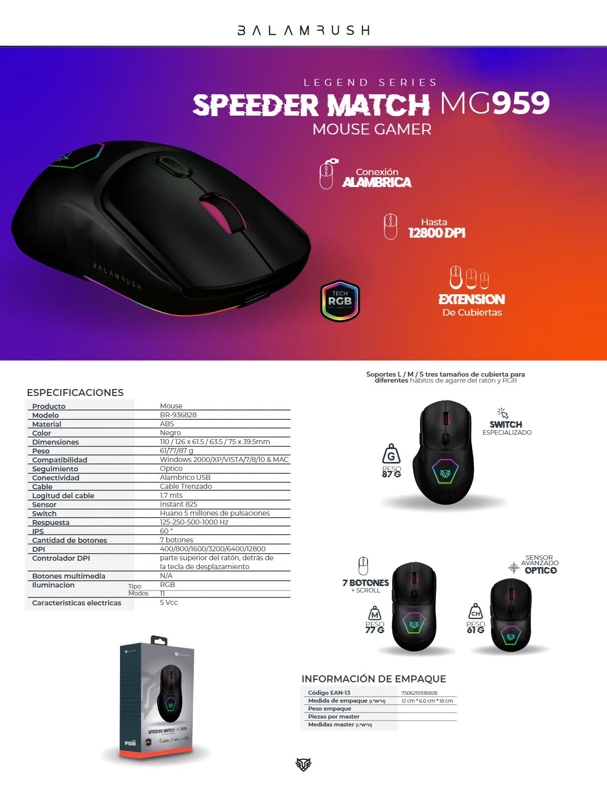 Mouse Gamer BALAM RUSH SPEEDER MATCH MG959 RGB / 12800 Dpi / 7 Botones + Scroll / Caratulas Intercambiables / Alámbrico / Usb / Switch Especializado / Sensor Optico / Negro