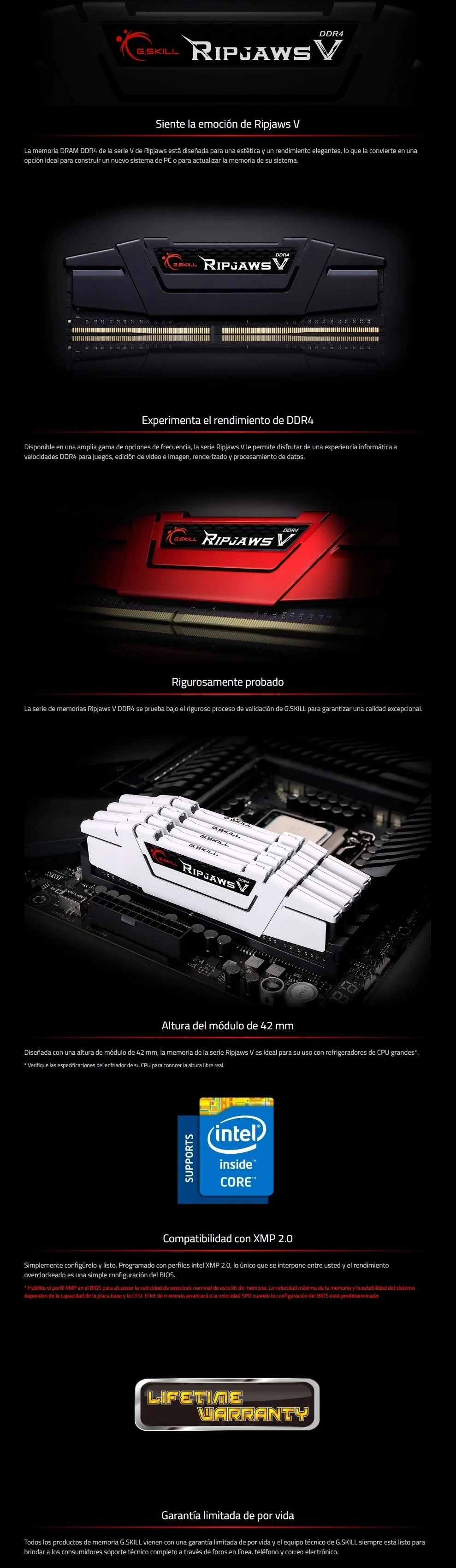 • La serie Ripjaws V le permite disfrutar de una experiencia informática a velocidades DDR4 para juegos, edición de video e imágenes, renderizado y procesamiento de datos.