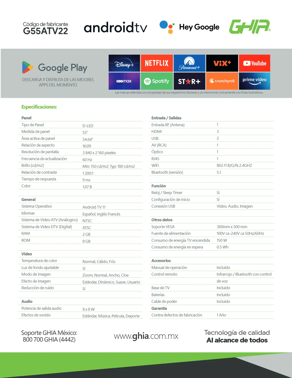 Smart TV GHIA G55ATV22 LED 55″ / 4K Ultra HD / RJ45 / x3 HDMI, x2 USB, x1RCA / AUX 3.5MM / Óptico / 60Hz / Bluetooth 5.1, WIFI / Color Negro