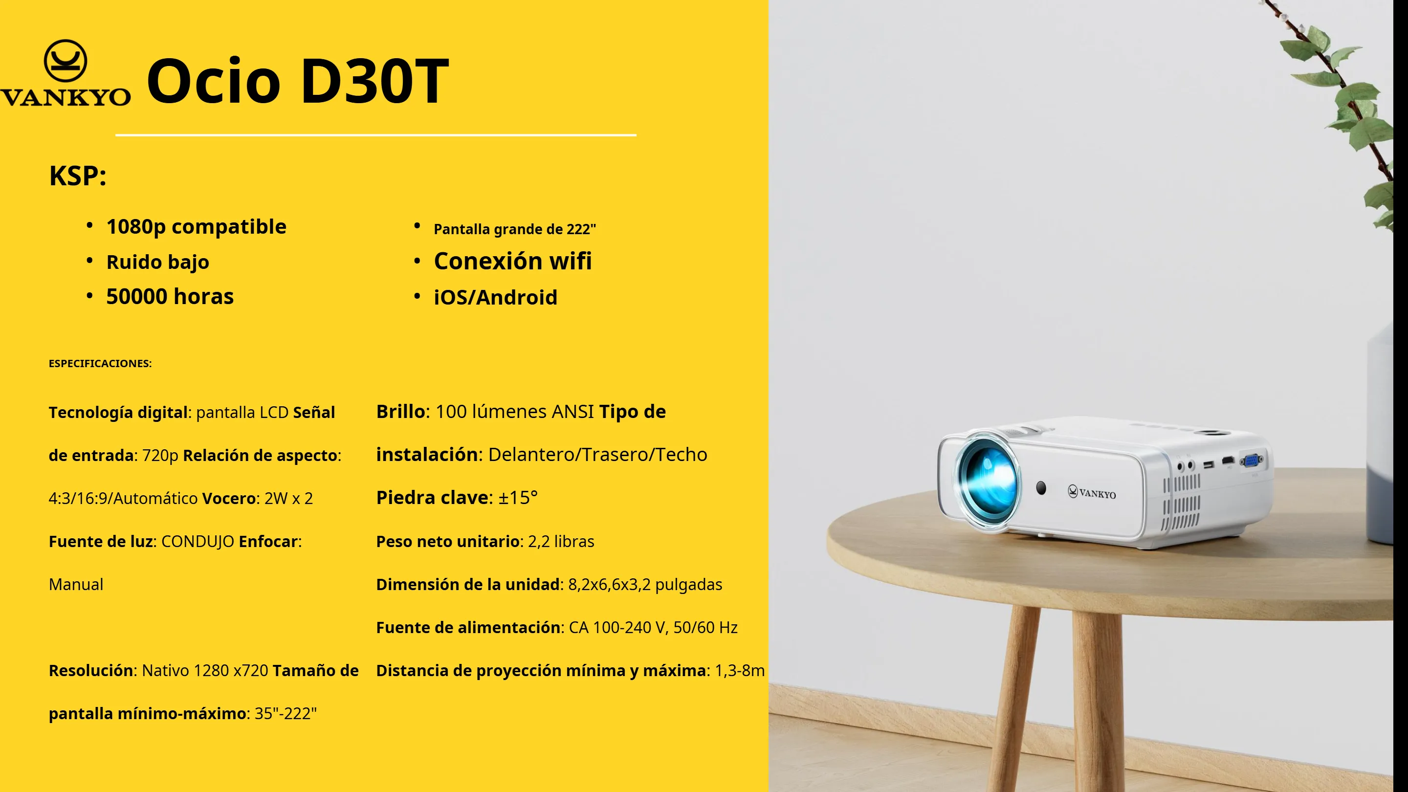 Proyector VANKYO Leisure D30T LCD / 100 Lúmenes Ansi / Resolución 1280 X 720 / HDMI, USB, AV, VGA, SD / WIFI / Color Blanco
