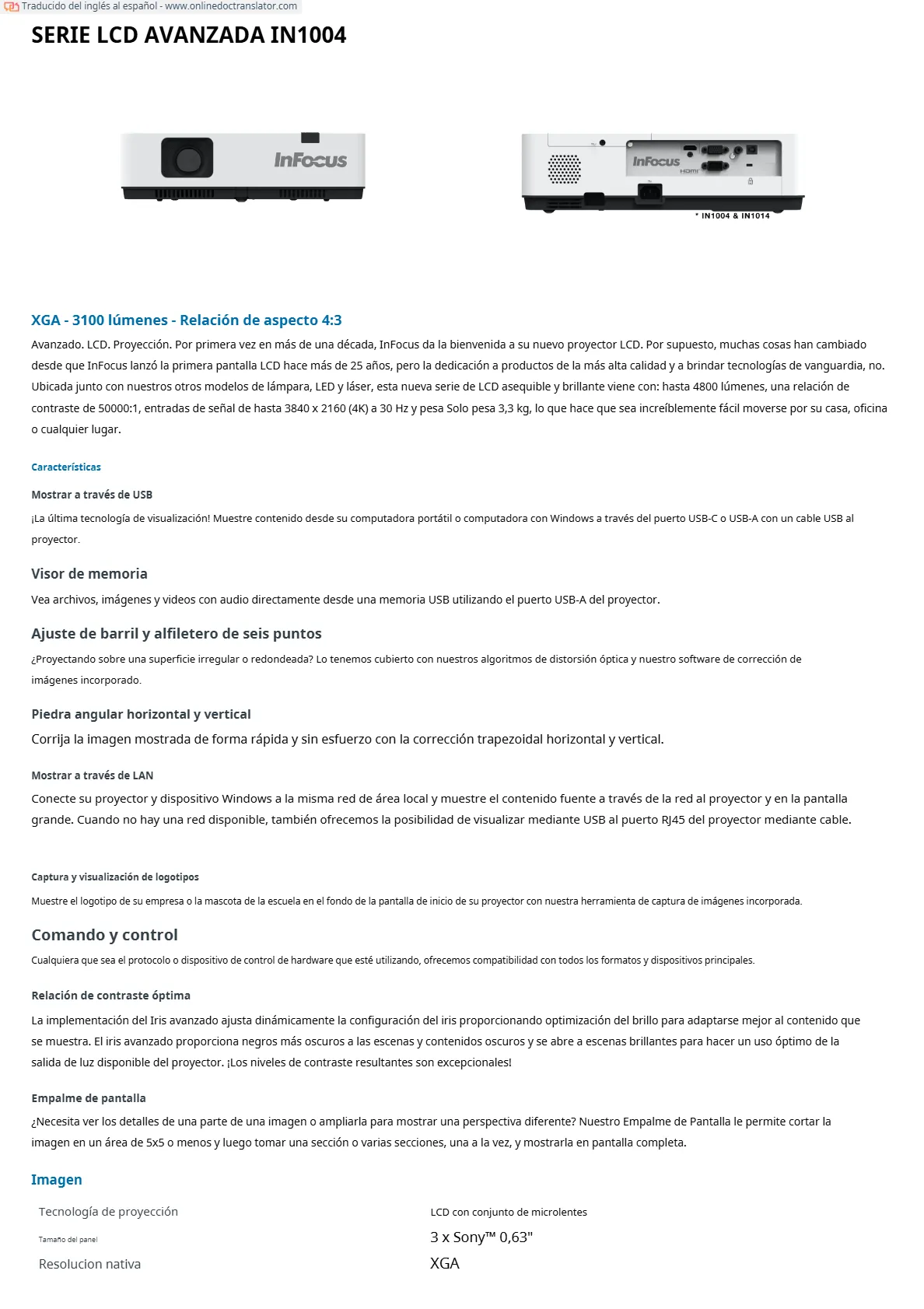 • El Proyector InFocus 3LCD es un dispositivo de alcance estándar con una resolución original XGA (1024×768) y brillo de proyección de 3100 lúmenes ANSI. El producto cuenta con una razón de contraste típica de 2000:1, lo que permite obtener imágenes nítidas y detalladas en cualquier entorno. Además, el intervalo de temperatura operativa del proyector oscila entre los 5 – 40 °C.