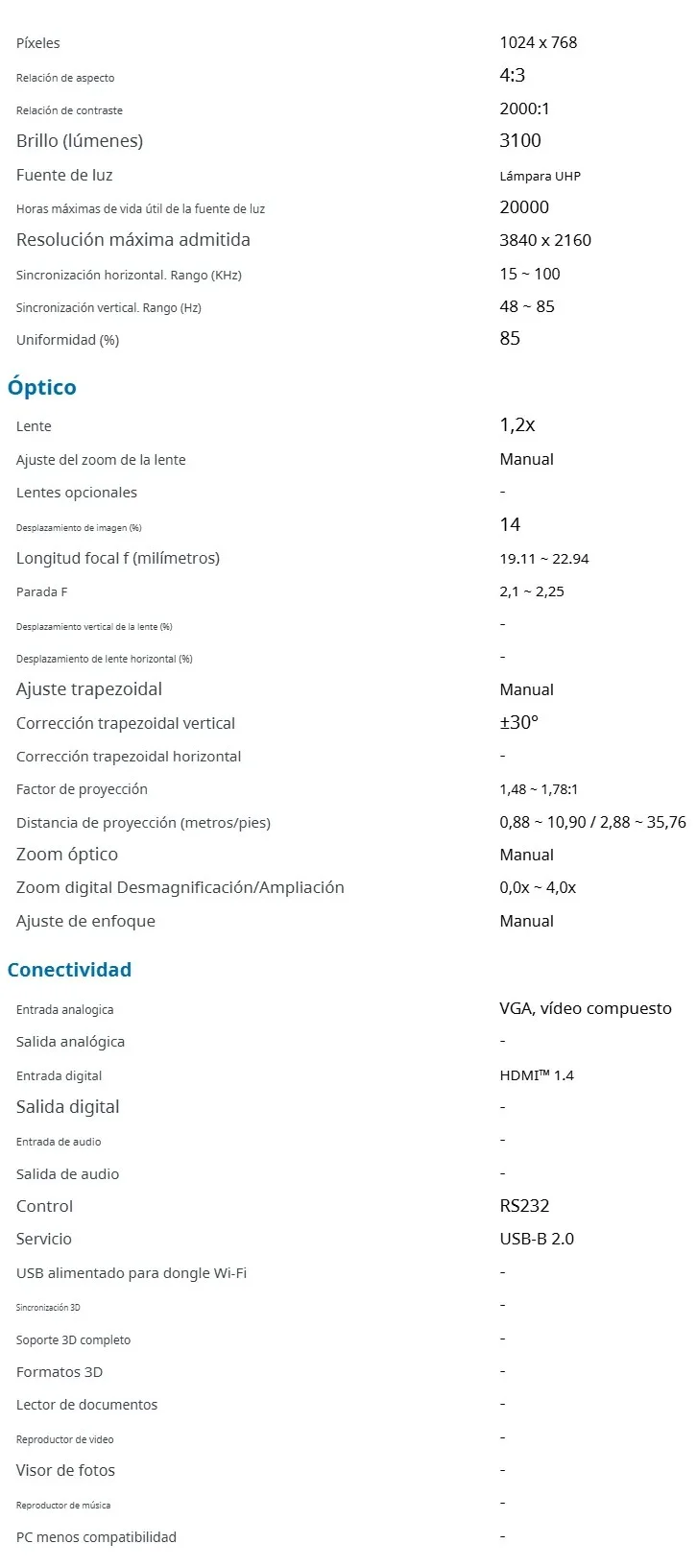 • Entre otras especificaciones técnicas destacables encontramos que este equipo utiliza tecnología LCD triple chip para generar las imágenes proyectadas; además posee capacidad zoom manual, así como compensación vertical/horizontal hasta un máximo del catorce por ciento. La vida útil estimada para la fuente luminosa UHP es superior a las veinte mil horas mientras que el nivel sonoro emitido durante su funcionamiento no supera los treinta y dos decibelios.