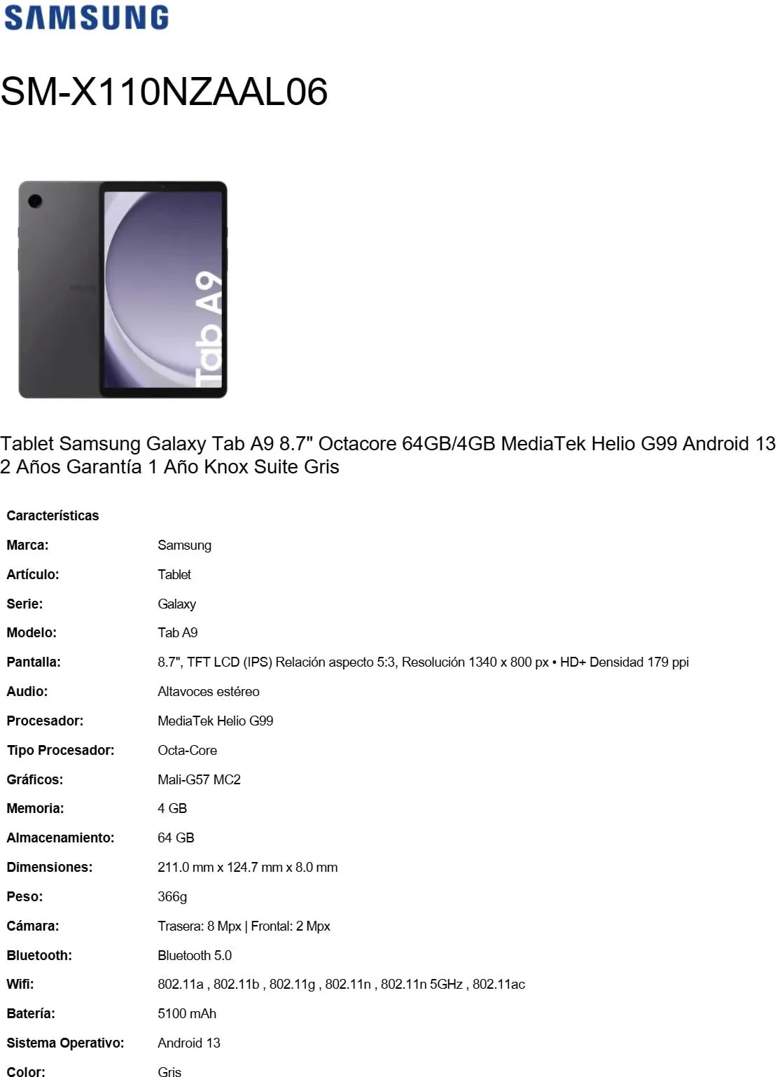 Tablet SAMSUNG GALAXY TAB A9 / MediaTek Helio G99 / 8.7″ / RAM 4GB / Almacenamiento 64GB / Android 13 / Cámara 8MP/2MP / WIFI / Bluetooth / Gris