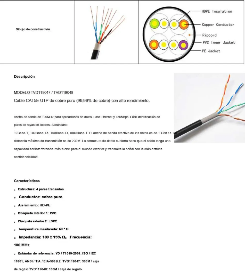 • Cable CAT5E UTP de cobre puro (99,99% de cobre) con alto rendimiento. Ancho de banda de 100MHZ para aplicaciones de datos, Fast Ethernet y 155Mbps.