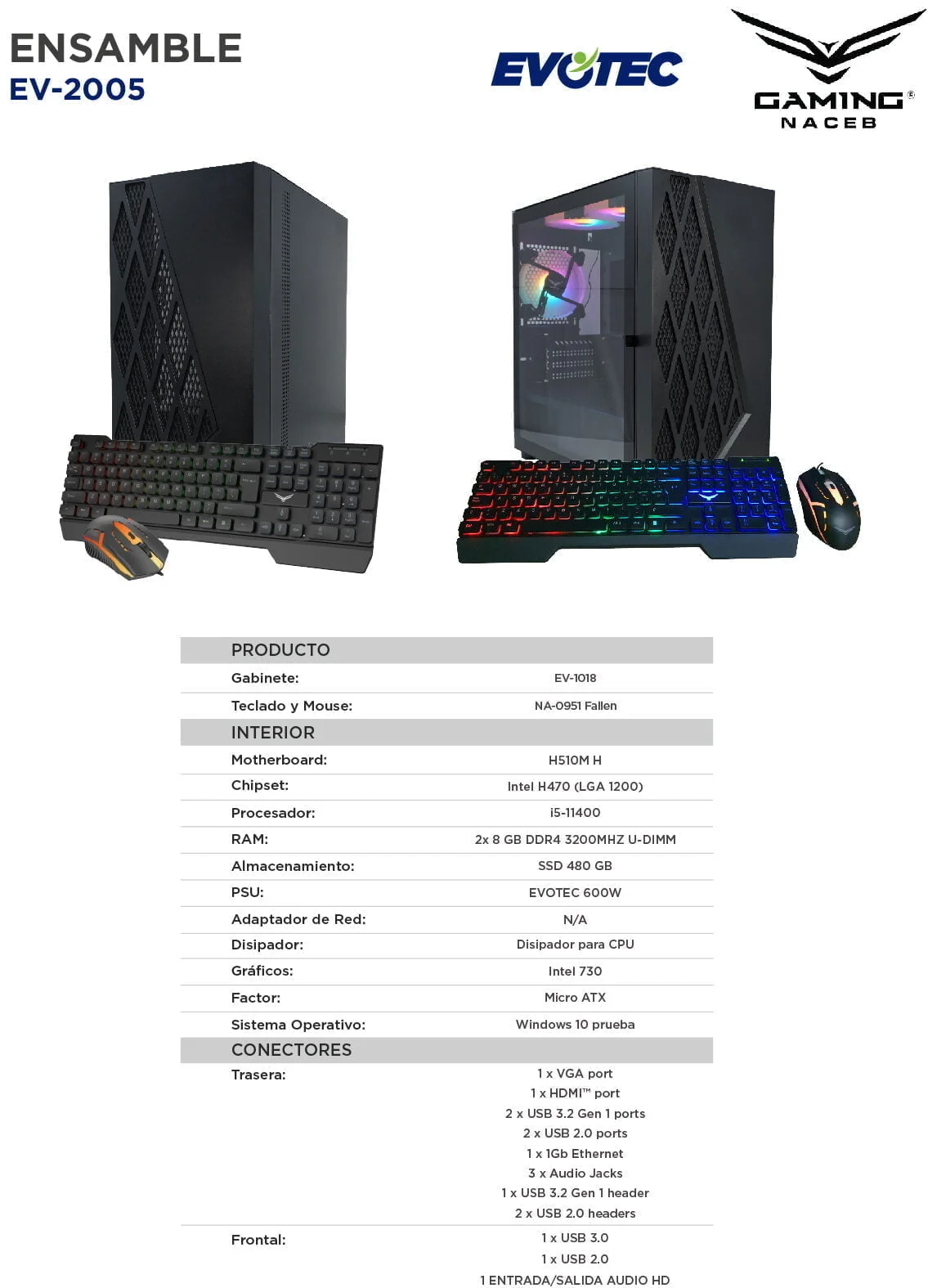 PC Gamer EVOTEC EV-2005 / Intel Core i5-11400 / Chipset: H510 / Memoria RAM 16GB / Almacenamiento SSD 480GB / Teclado Y Mouse: Na-0951 / Negro