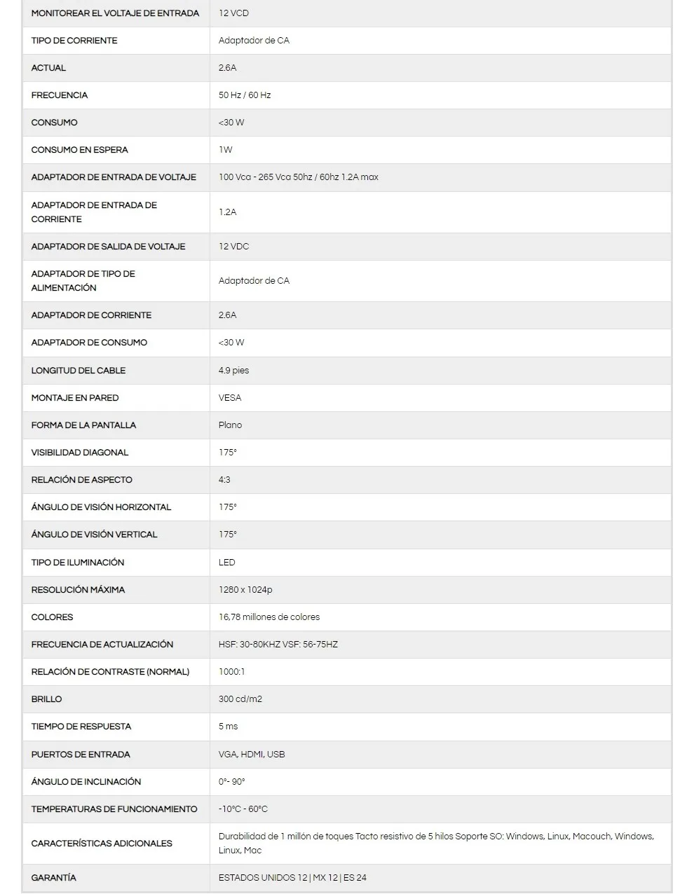 Monitor táctil QIAN 17 TIAGO / 17” / 1280 X 1024 FULL HD / 60Hz / Panel LED / 5MS / VGA, Hdmi, USB / Durabilidad 1 Millón De Toques / Negro