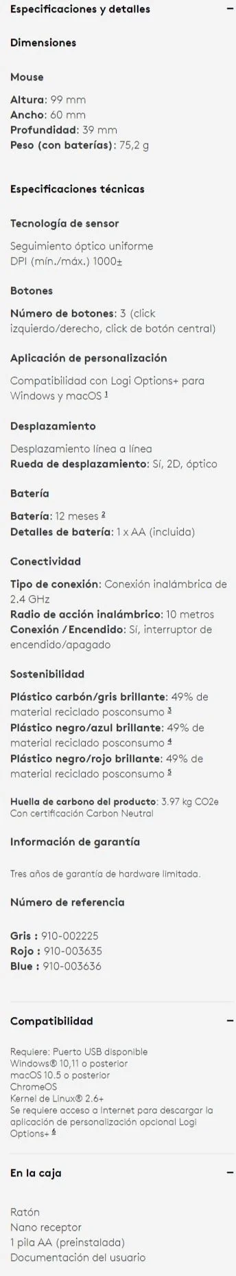 • Este modelo en particular viene en color negro y utiliza una batería AA para su funcionamiento, siendo capaz de soportar hasta una unidad al mismo tiempo. Además, el receptor inalámbrico del mouse es tipo Nano y se conecta mediante USB.