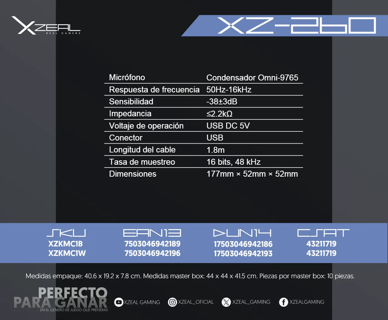 • Con el micrófono Xzeal descubrirás una nueva forma de captar y emitir audios. Fiel reflejo de la realidad Con este producto lograrás que la reproducción obtenida sea lo más parecida a la original. Excelente para grabar voces debido a su sensibilidad y amplio rango de frecuencia. Un formato a tu medida Al ser condensador posibilitará un resultado claro y fino. Es ideal para percusiones, guitarras, pianos, entre otros. Por su respuesta tan definida ante la voz, es el más elegido por los profesionales.
