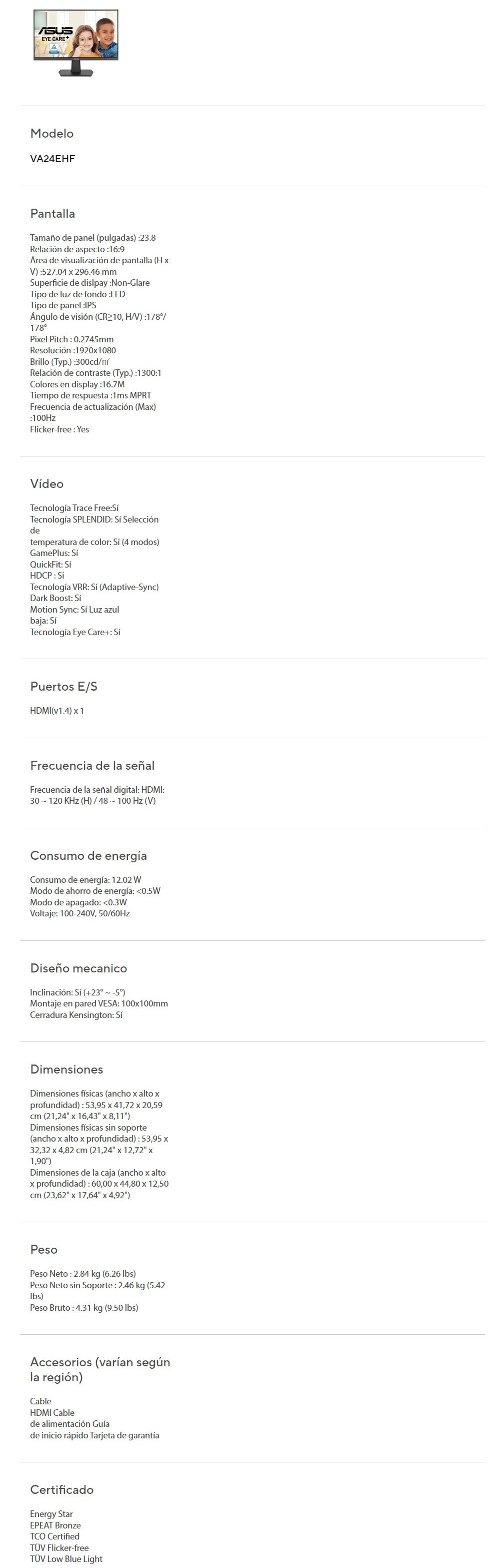Monitor Gamer ASUS VA24EHF Eye Care / 23.8″ / 1920 X 1080 FHD / 100Hz / 1ms / Hdmi / Panel IPS / Adaptive-Sync / Negro