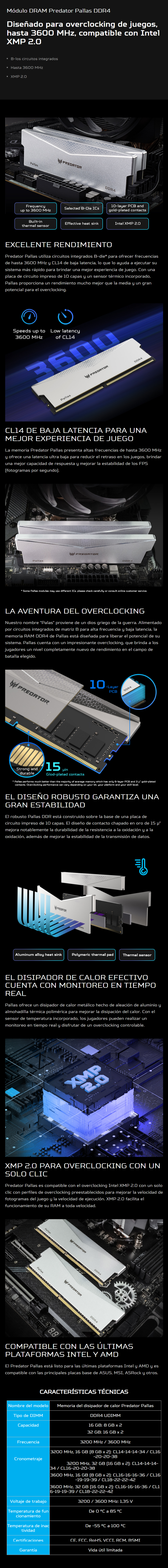Kit De Memoria RAM ACER PREDATOR Pallas / 32GB (2x16GB) / DDR4 3600MHz / CL18 / 1.35V / Plata