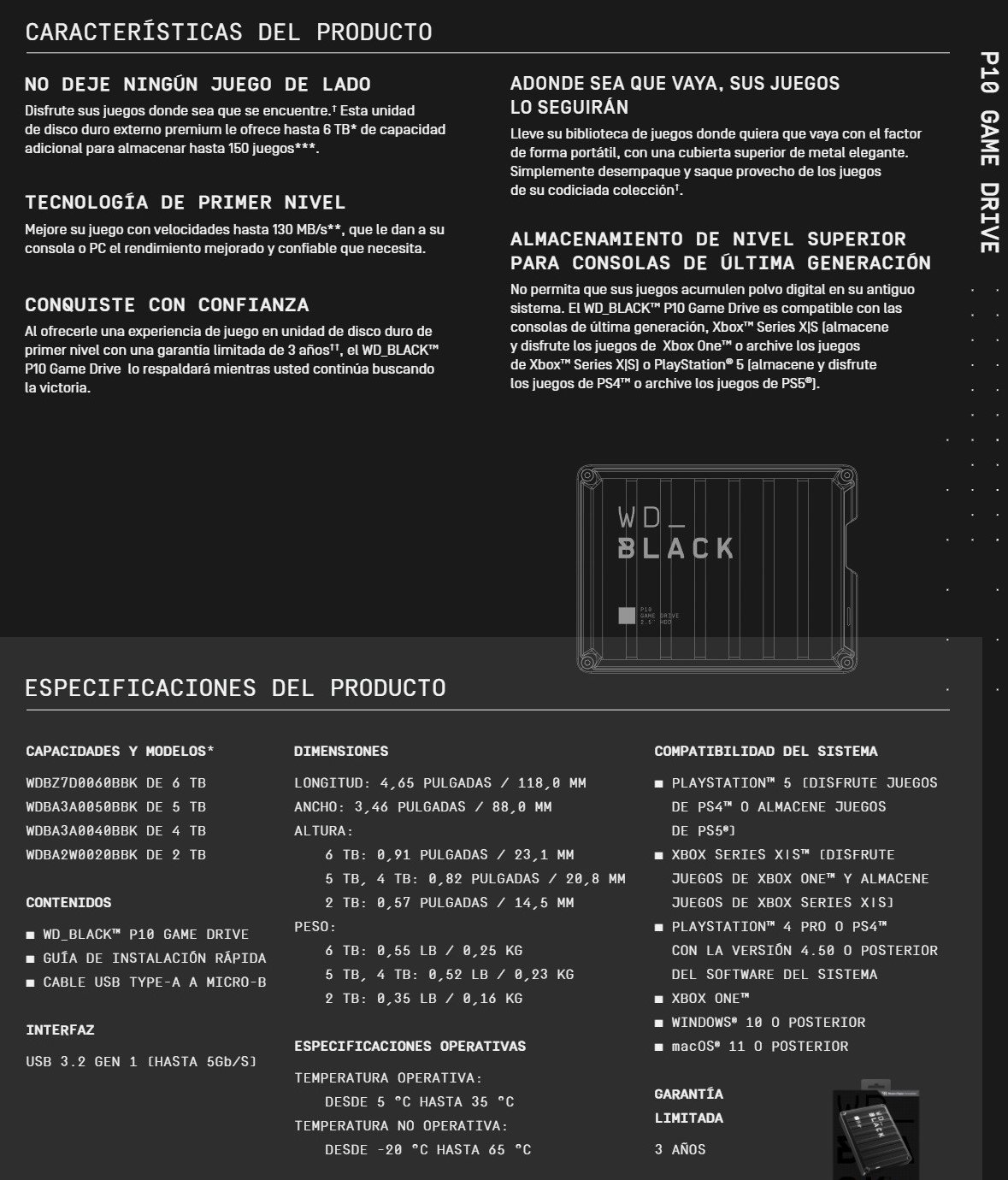 • Unidad diseñada especialmente para jugadores y basada en la calidad y confiabilidad de WD_BLACK a fin de que usted pueda jugar sin límites.