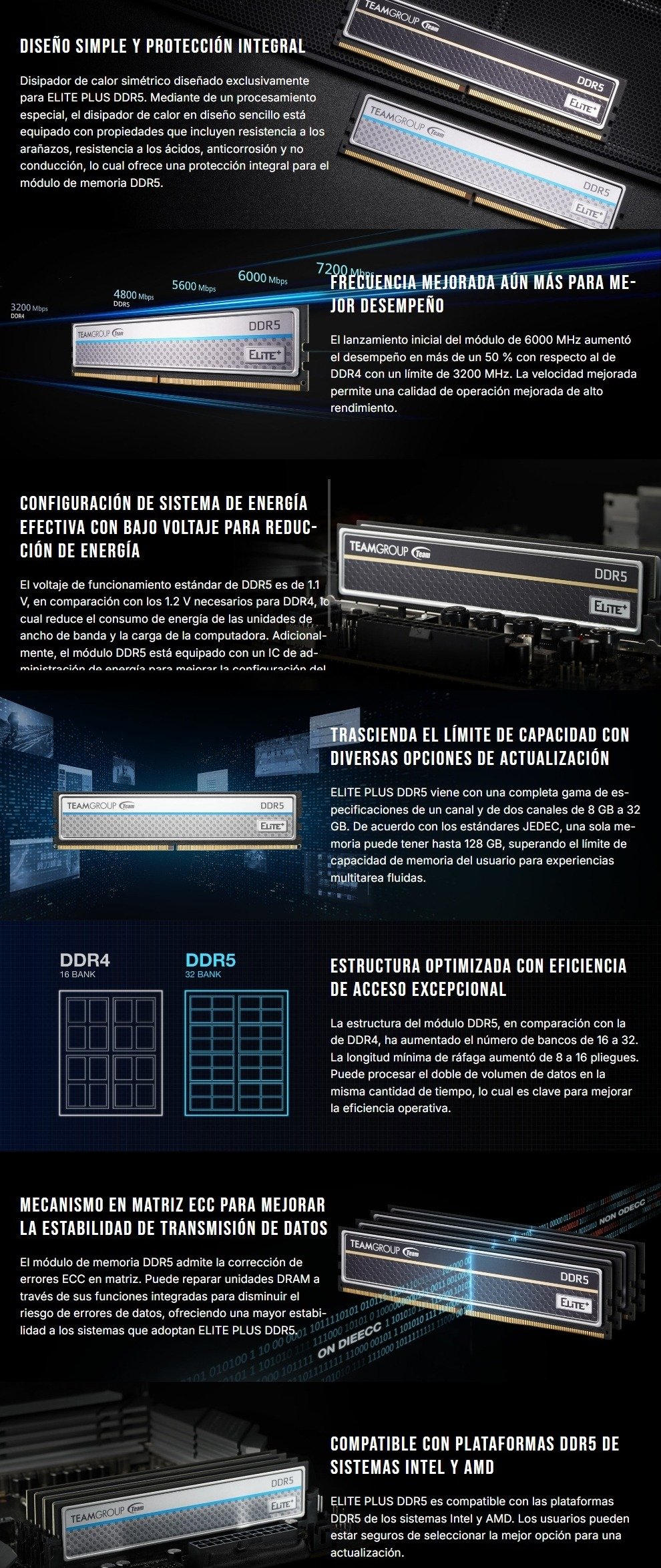 Kit De Memoria RAM Team Group Elite Plus / 32GB 2X 16GB / DDR5 6000MHz / CL48 / 1.1V / DIMM / Color Negro