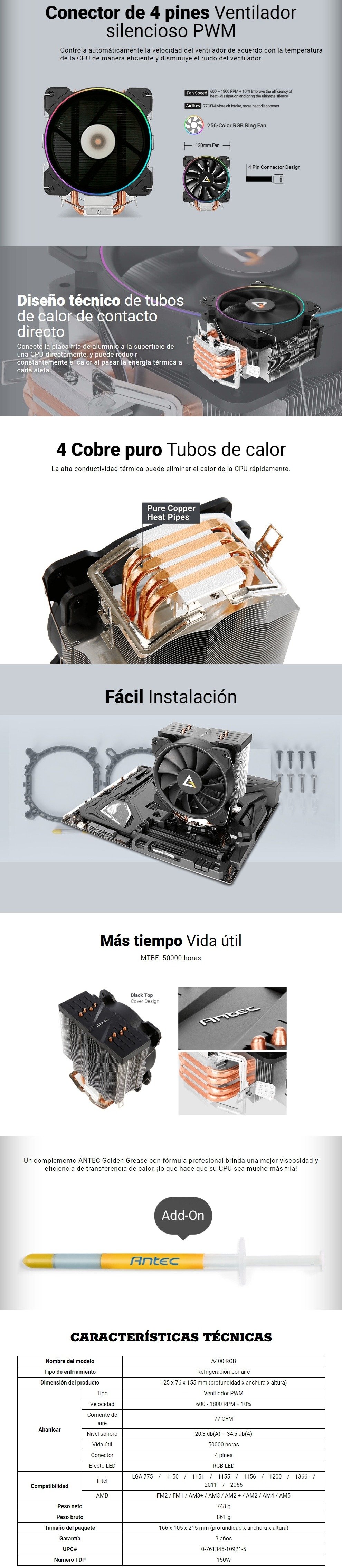 Disipador ANTEC A400 RGB / X1 Ventilador PWM 120mm / 600-1800 RPM+10% / 77 CFM / 20,3-34,5 dbA / 4 Pines / TDP 150W / Intel, AMD / Negro