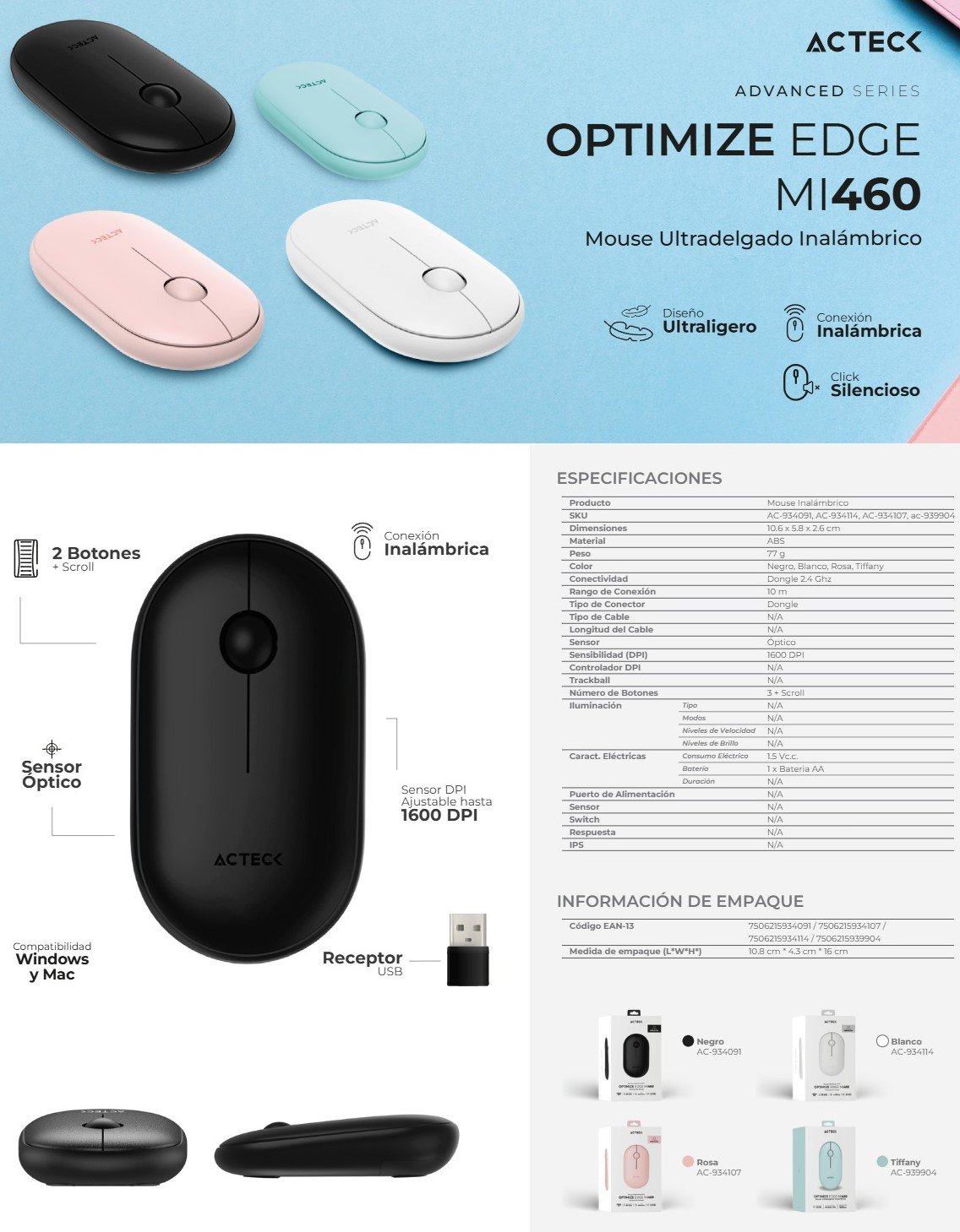 Con conectividad inalámbrica de 2.4 GHz, este mouse te ofrece la libertad de movimiento sin la molestia de los cables. Su resolución de 1600 DPI garantiza una precisión excepcional en cualquier tarea que realices. Equipado con dos botones intuitivos, el MI460 simplifica tu experiencia de uso sin sacrificar la funcionalidad.
