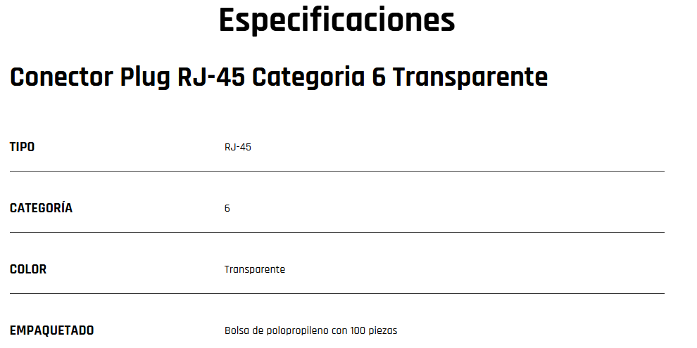 El tipo de conector utilizado es el RJ-45, uno de los más comunes en la industria debido a su facilidad de uso y compatibilidad con diferentes tipos de cables. Además, este modelo se encuentra dentro de la categoría Cat6, lo cual significa que puede soportar velocidades hasta Gigabit Ethernet (1 Gbps).