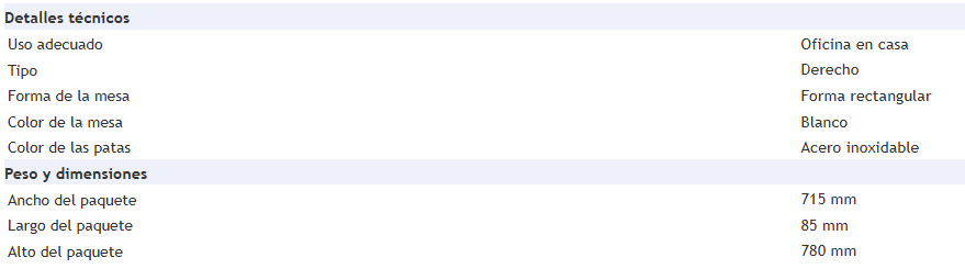 Este producto es una mesa de oficina en casa de tipo derecho. Tiene una forma rectangular en la parte superior y está fabricada en color blanco. Las patas de la mesa son de acero inoxidable. El paquete tiene un alto de 780 mm, un ancho de 715 mm y un largo de 85 mm. Esta mesa es perfecta para ser utilizada en una oficina en casa.