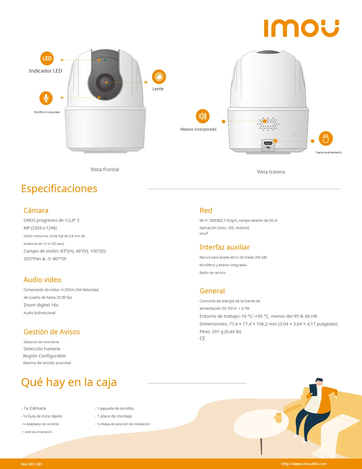 • Con monitoreo en vivo de 3MP 2K y funciones de giro de 0~355° e inclinación de -5~80°, el Ranger 2C 3MP asegura que todos los rincones de su hogar estén completamente cubiertos. La detección humana encuentra rápidamente objetivos humanos en imágenes e inmediatamente le envía una notificación. El modo de privacidad ayuda a proteger su privacidad personal cuando está en casa, y la función de seguimiento inteligente permite que la cámara siga objetos en movimiento cuando detecta movimiento.