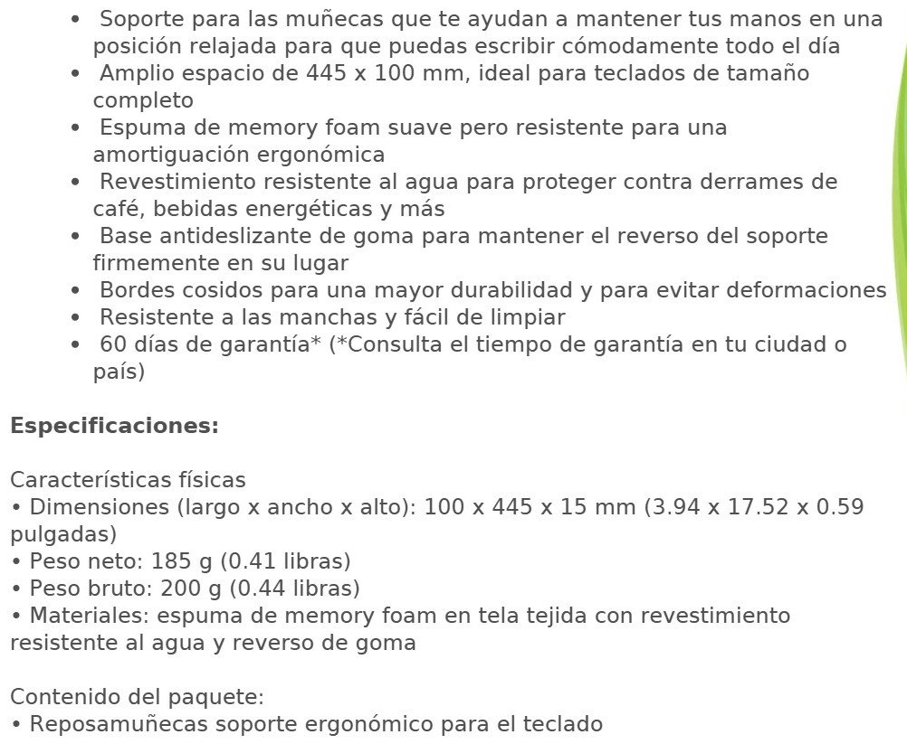 Descansa muñecas para teclado con tecnología memory foam para mayor comodidad, suave al tacto con base anti derrapante para mayor estabilidad.