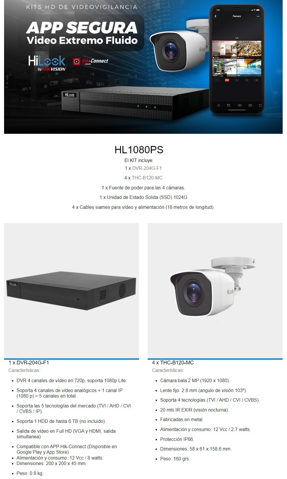 Kit De Videovigilancia HILOOK Turbo HD / 2MP / 1920x1080P DVR 4 Canales / 4 Cámaras Tipo Bala / Protección IP66 / Inc. Fuente De Poder
