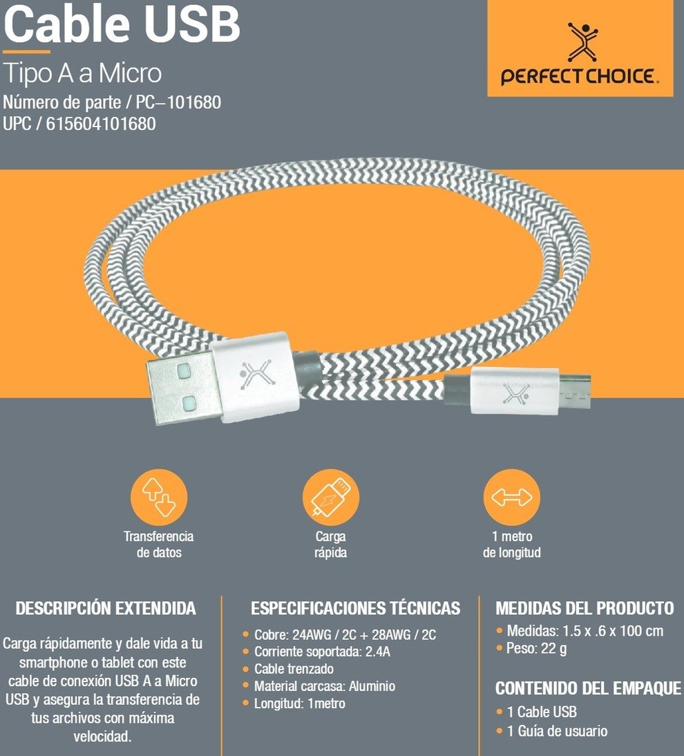 Cable PERFECT CHOICE PC-101680 / MICRO-USB/USB-A / Macho A Macho / Carga Rápida 2.4A / 28 AWG / 1 Metro / Blanco