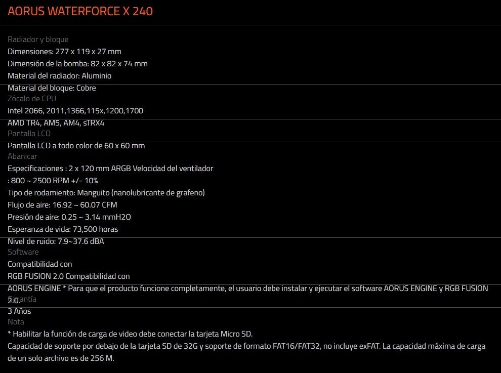 Enfriamiento Liquido AIO AORUS WATERFORCE X 240 / 240MM / 800-2500 RPM / 60.07 CFM / 37.6 dBA / Intel-AMD / Pantalla LCD Personalizable / Compatibilidad Con Aorus RGB Fusion / Negro