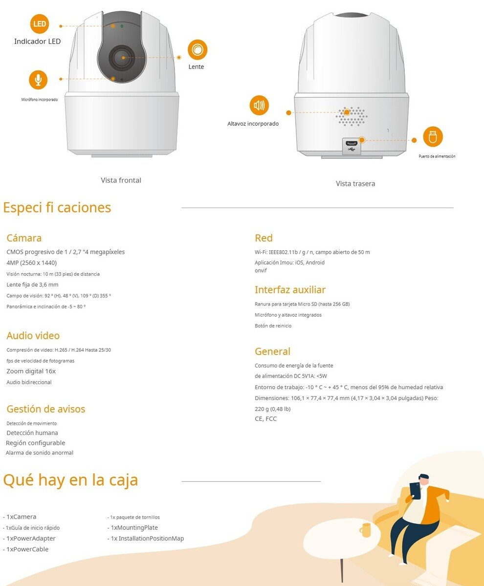 Cámara De Vigilancia IMOU IPC-TA42N / 4Mp / 2560X1440 QHD / H.265 / Full Color / Tracking Inteligente De Humanos / Lente 3.6mm / Ir De Luz 10Mts / Micrófono / Bocina / Visión Nocturna / Modo Privacidad / Para Interior / SD Máx. 256 GB / Blanco