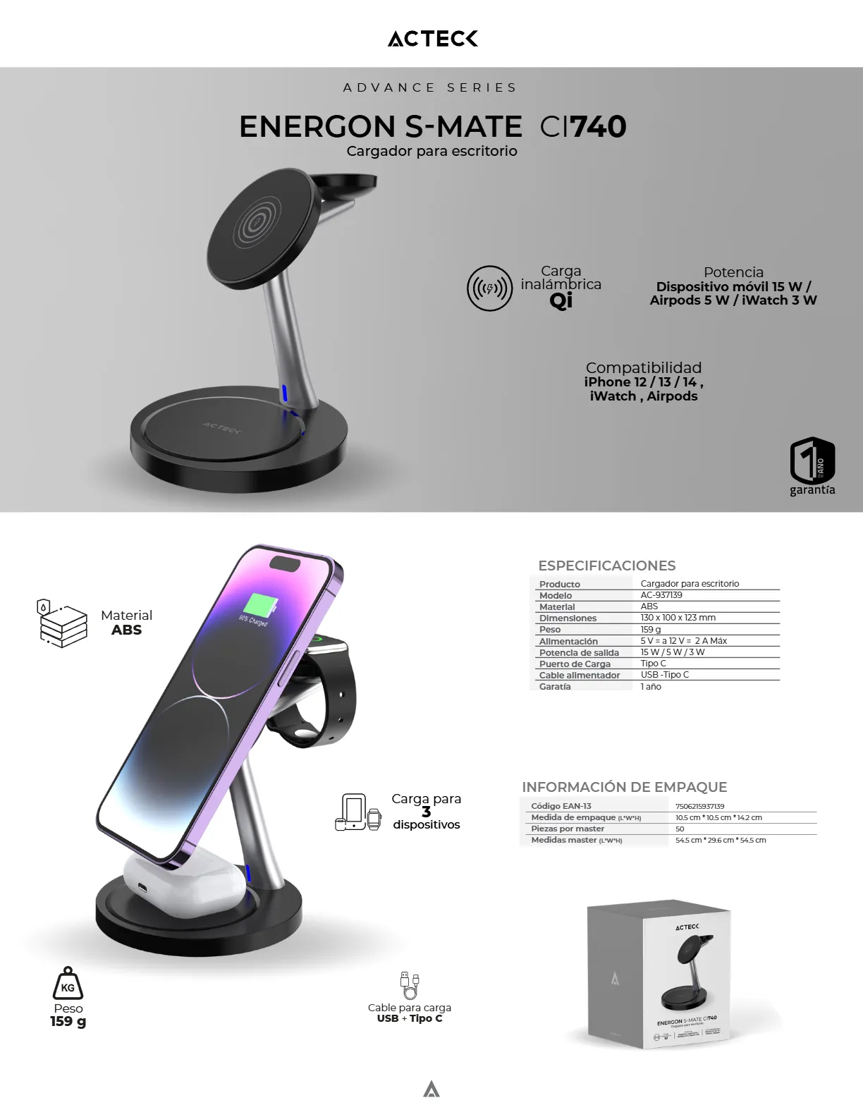 Cargador ACTECK ENERGON S-MATE CI740 / 3 En 1 / Inalámbrico / Magnético / USB Tipo C / Color Negro / AC-937139