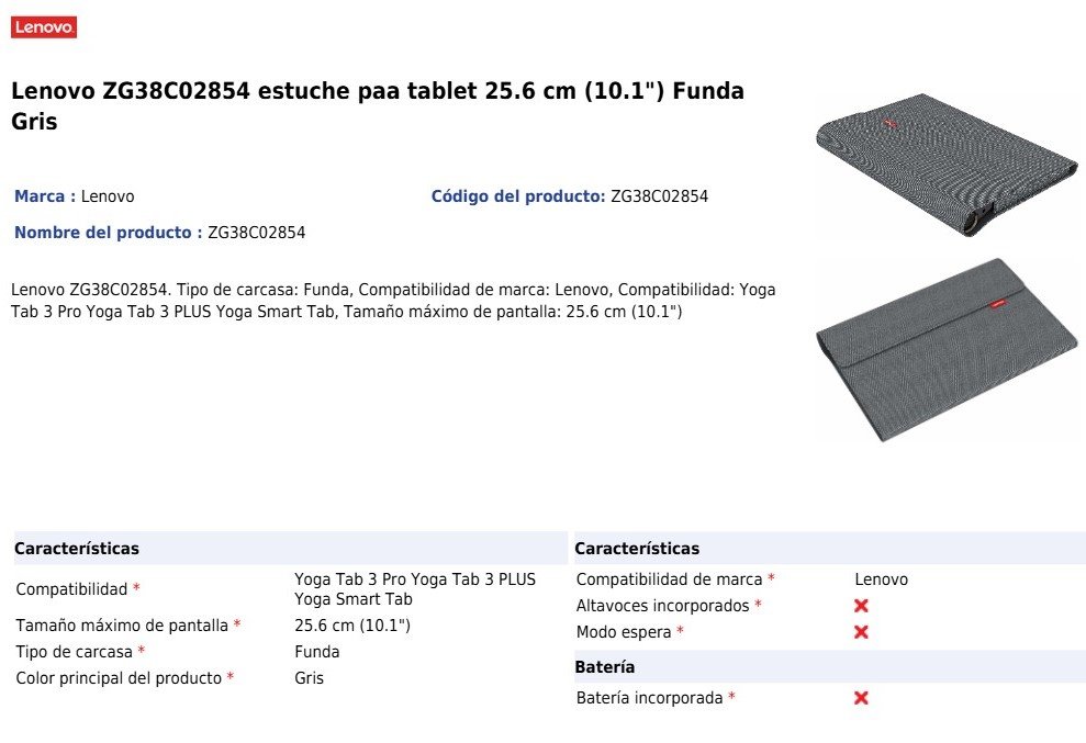 Este producto Lenovo es una funda de color gris diseñada para ser compatible con las tablets Yoga Tab 3 Pro, Yoga Tab 3 PLUS y Yoga Smart Tab. Tiene un tamaño máximo de pantalla de 25.6 cm (10.1″).