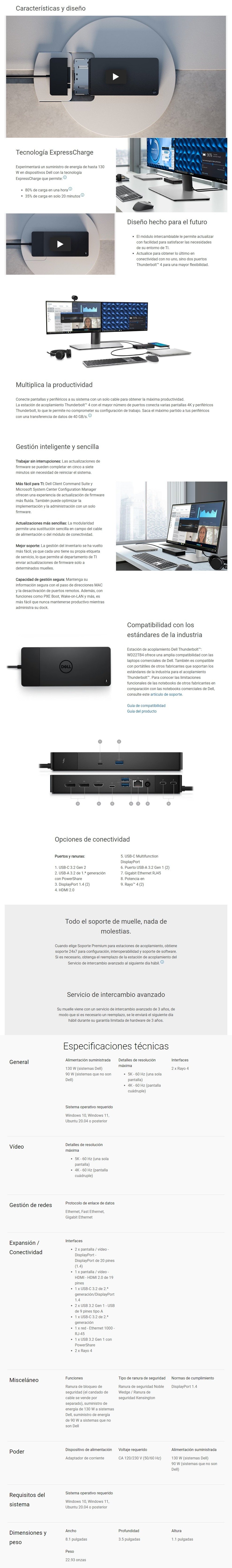 Docking station 12 en 1 DELL THUNDERBOLT WD22TB4 / 12 Puertos / USB-C / X3 USB-A, X2 DisplayPort, X1 HDMI, X4 USB-C, X1 RJ45, X1 Puerto De Carga Dell Expresscharge / Compatible Con Múltiples Equipos / Color Negro