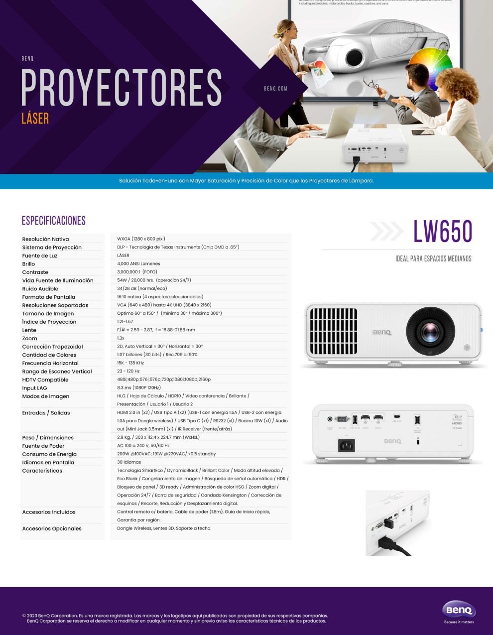 Proyector BENQ LW650 / Láser / DLP / 4000 Lúmenes ANSI / Resolución WXGA 1280 X 800 / X2 HDMI, X2 USB 2.0, 3.5 Mm / Con Bocinas / Blanco