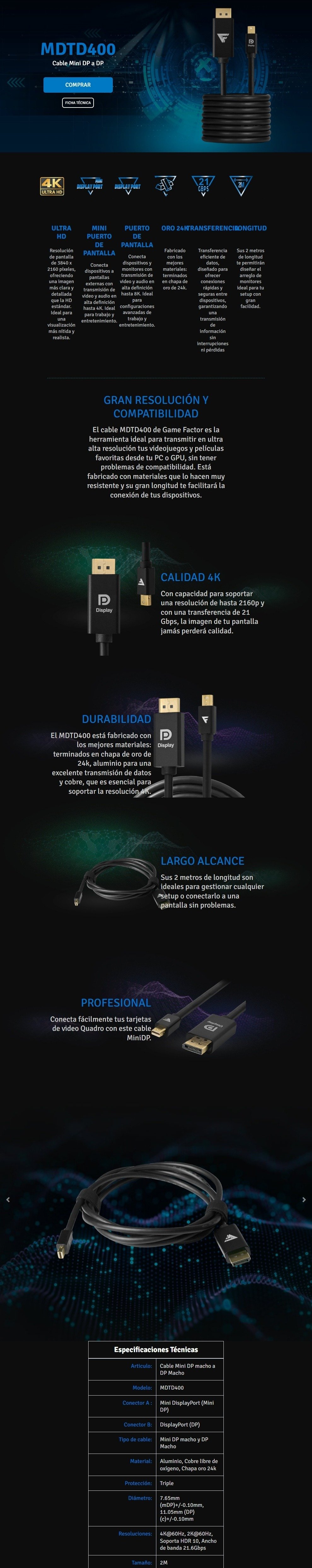 Cable DisplayPort GAME FACTOR MDTD400 / Mini Displayport A Displayport / 4K ULTRA HD / 2 Metros / Chapados En Oro 24K / Color Negro