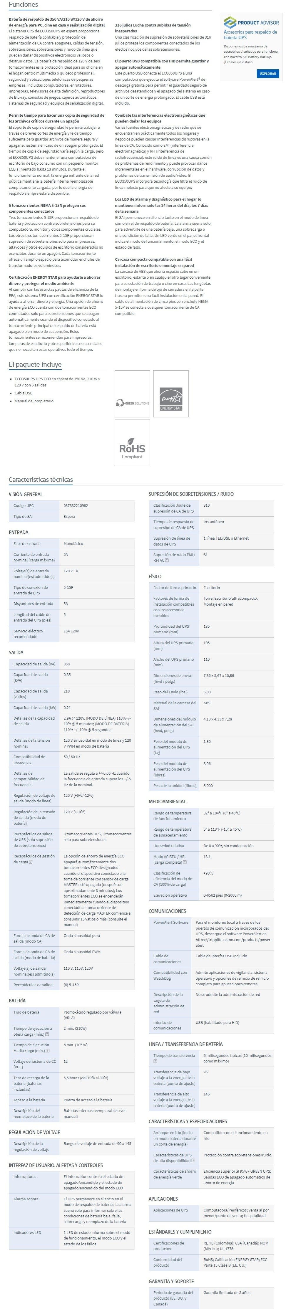 • 6 tomacorrientes NEMA 5-15R alimentan y protegen PC, cine en casa o equipos de señalización digital.