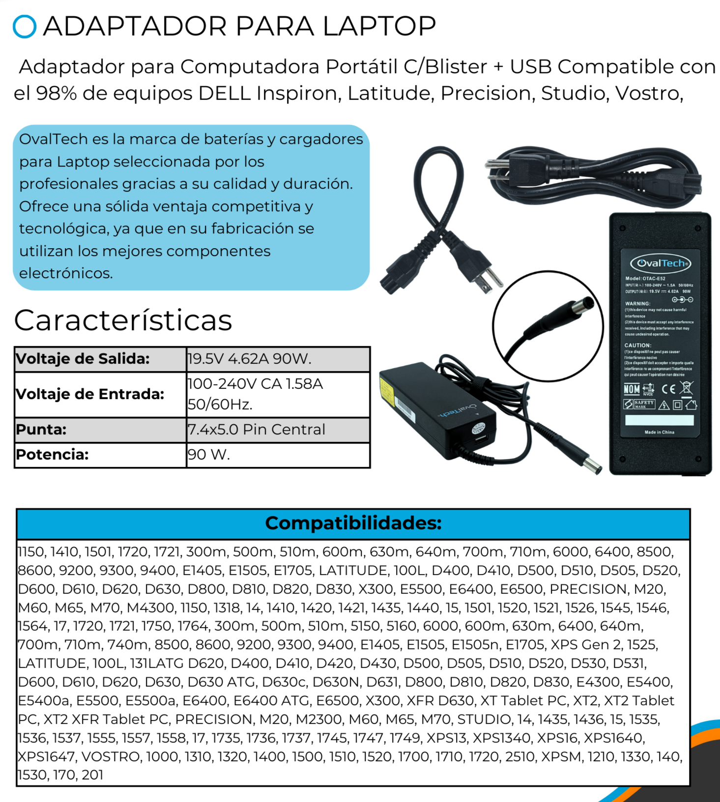 Cargador/Adaptador OVALTECH para Laptop – OTAC-E52, 90W, 19.5V, 4.62A, (7.4*5.0), Color Negro
