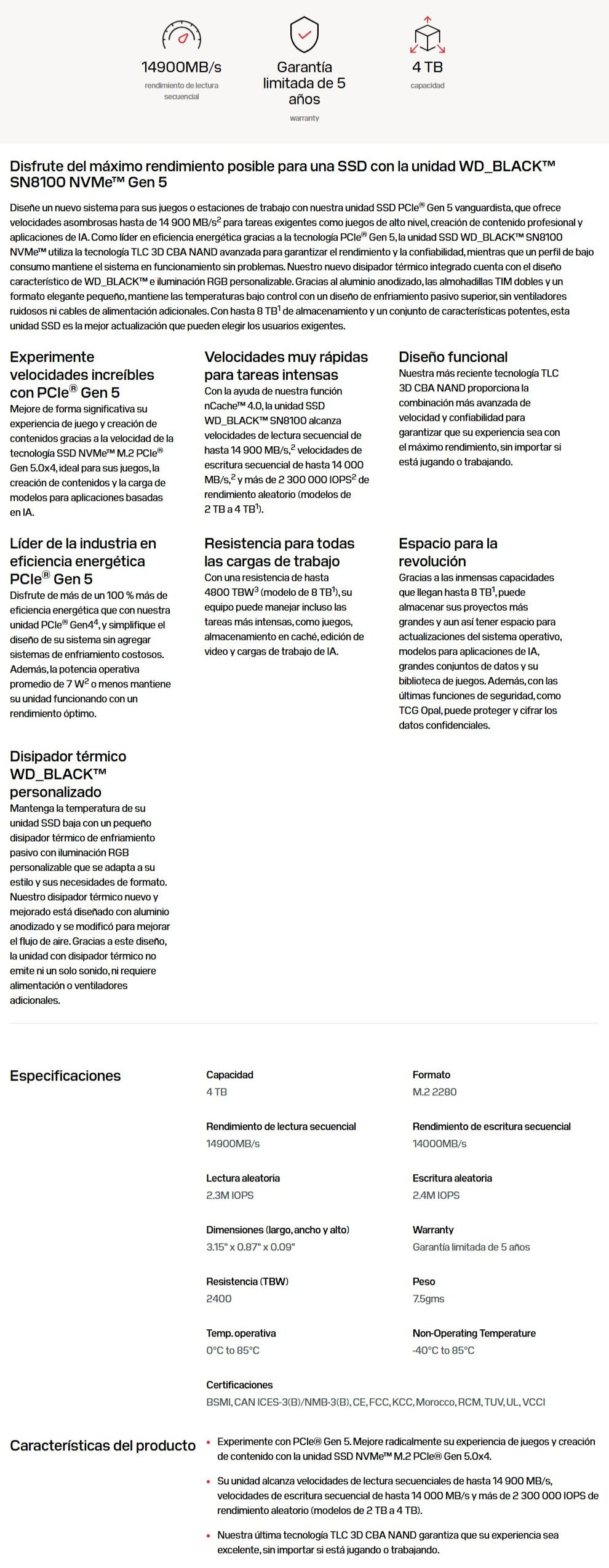 Unidad SSD M.2 NVMe WESTERN DIGITAL SN8100 – 4TB, M.2 2280, PCIe 5.0, Lectura 14900 MB/s, Escritura 14000 MB/s