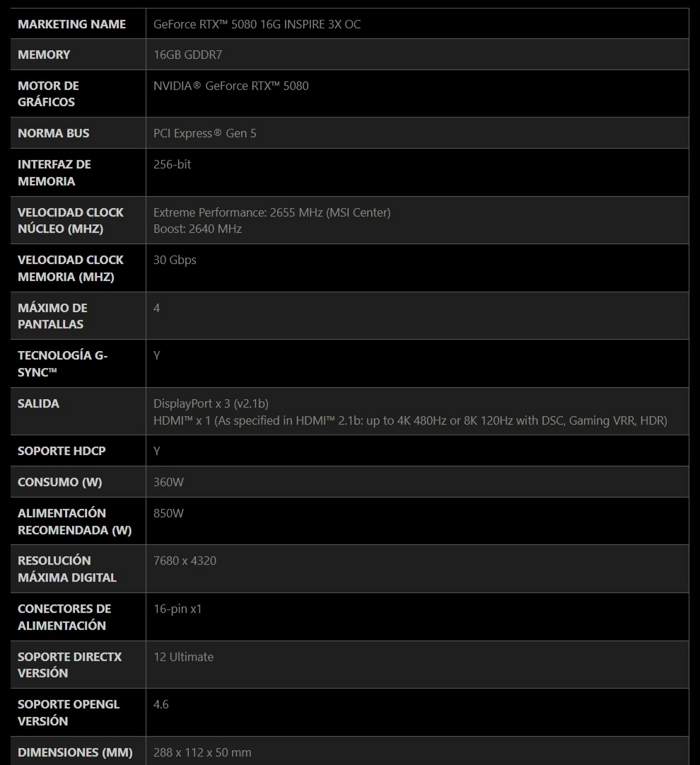 Tarjeta de Video MSI NVIDIA GeForce RTX 5080 16G INSPIRE 3X OC
