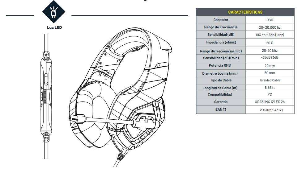 Diadema GAMER YEYIAN Wicked S3000 / Alámbrico / Con Micrófono / 2.2 Metros / Luz Led / Negro C/Rojo