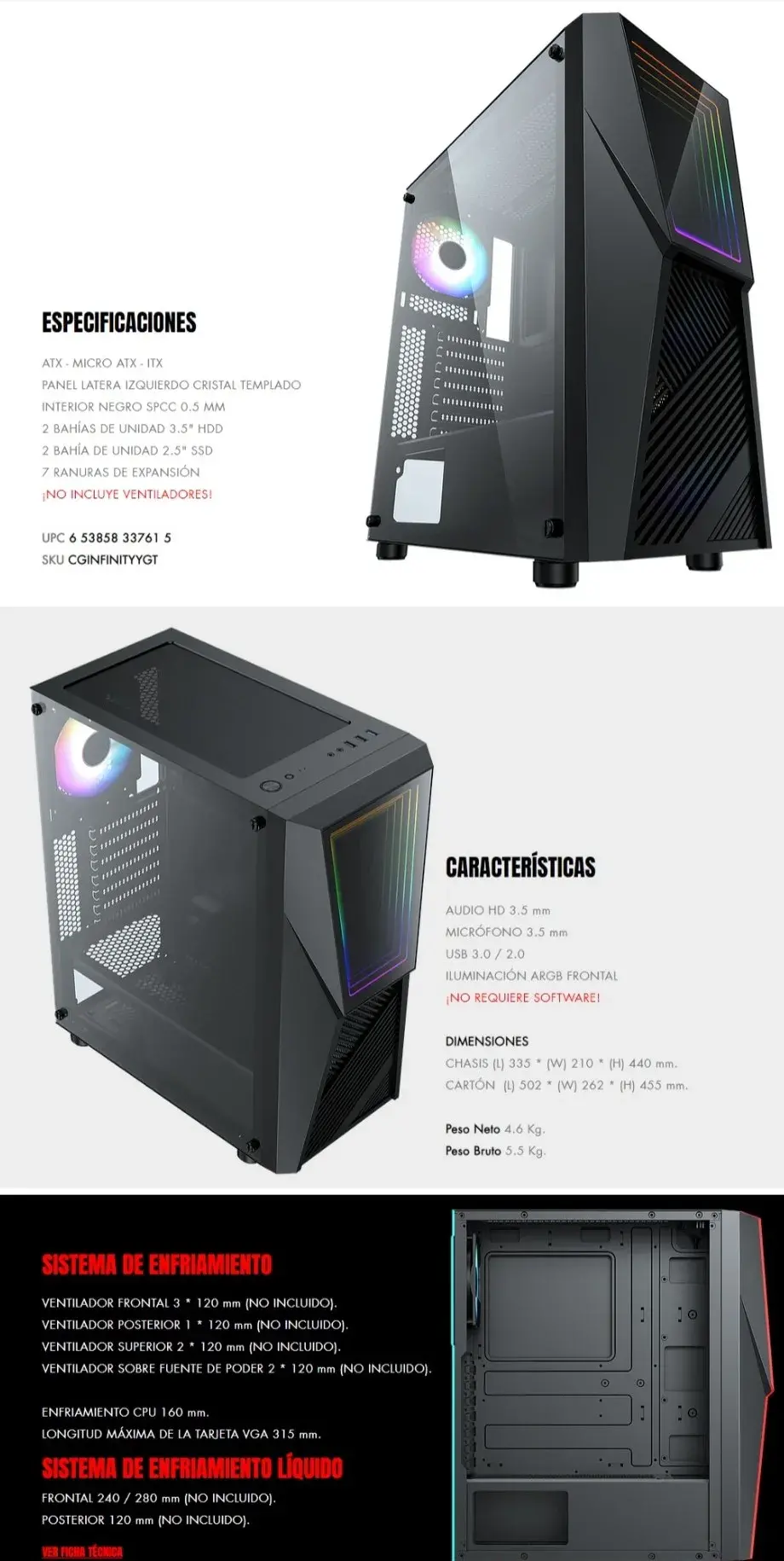 Gabinete Yaguaret Infinity / ATX, MICRO ATX / ARGB / Cristal Templado / HDD / SSD / Usb 3.0 / Negro