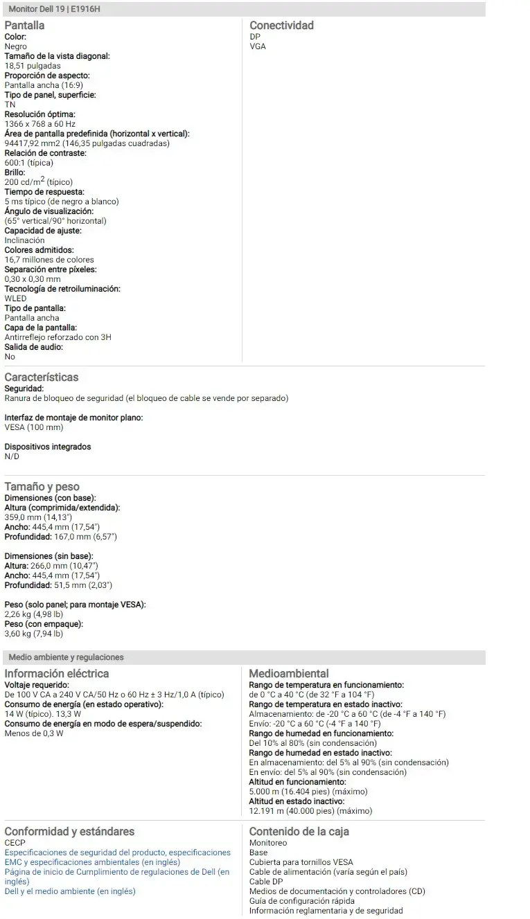 Monitor Led Dell E1916hv / 18.5″ / 1366 X768 / 60HZ / Pantalla Plana / Panel Tn / Vga,Dp / Vesa / Negro