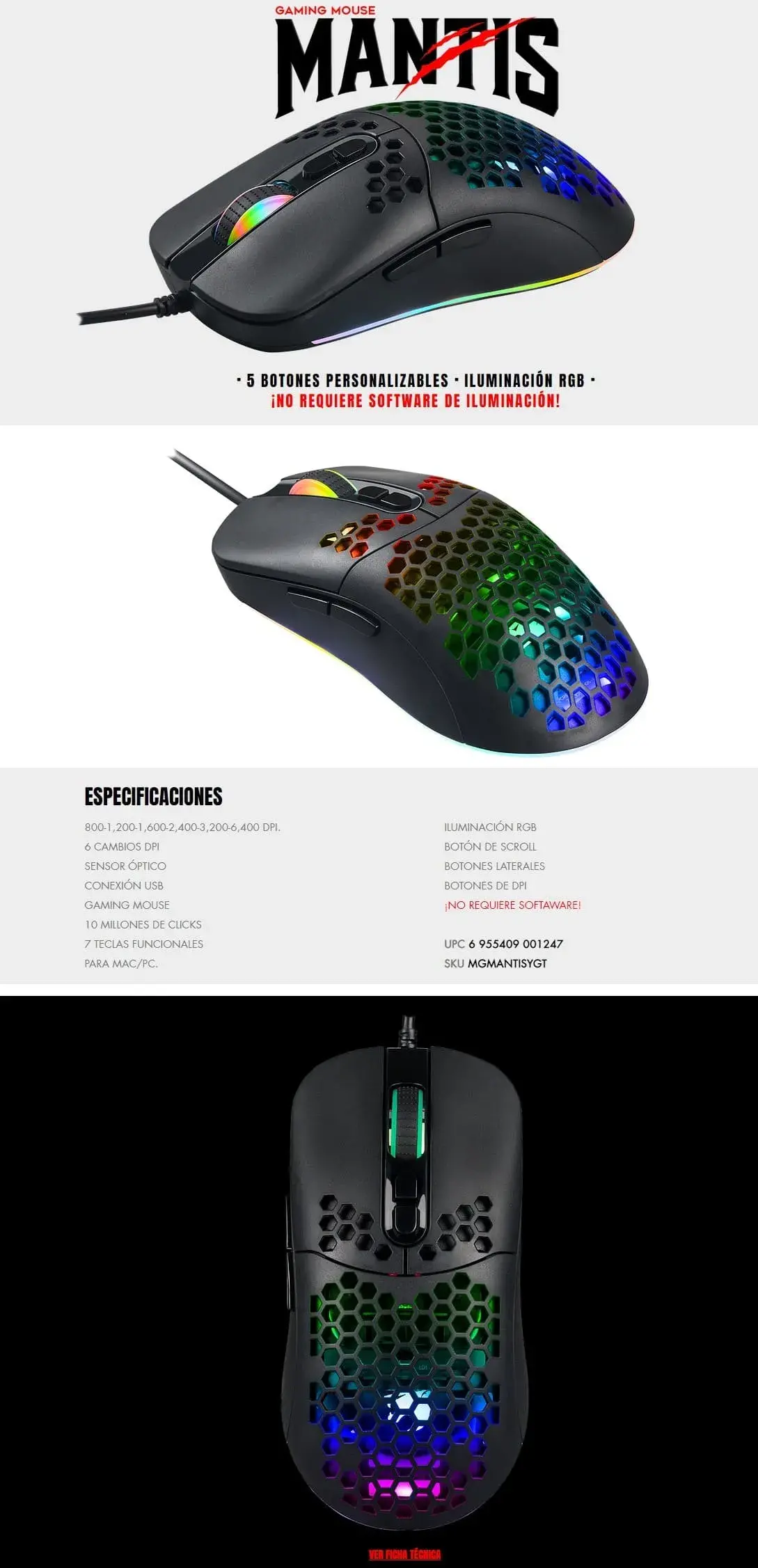 Mouse Gaming Yaguaret Mantis / RGB / 6400 Dpi / 5 Botones Personalizables / Usb / Negro